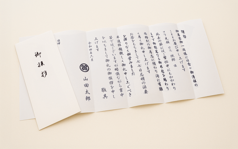 セレサでは、お買上の返礼品には家紋入り挨拶状を無料で作成いたします。はがきタイプの挨拶状も選択できます。